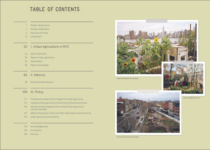 Five Borough Farm: Seeding the Future of Urban Agriculture in New York City provides the most detailed survey ever produced about urban agriculture in New York City. The study recommends initiatives to connect farmers’ and gardeners’ grassroots efforts to municipal policy and provide a framework for understanding and measuring how urban agriculture contributes health, social, economic, and ecological benefits to the city. Five Borough Farm also demonstrates the effectiveness of the Design Trust’s unique approach. We assembled a multidisciplinary team, including experts in food policy, sustainable design and public health evaluation, a graphic designer and photographer, and engaged more than 100 key stakeholders. Based on this outreach and research, we have documented farms and gardens citywide and identified the urban agriculture community’s leading priorities, opportunities, and challenges.